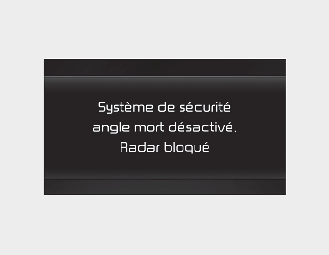 Si cela se produit, le système « Blind-Spot Safety » (Sécurité des angles morts) est alors désactivé. « Radar blocked » (Radar obstrué) s'affichera sur le tableau de bord.