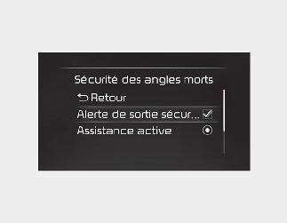 Avec le commutateur ENGINE START/STOP (démarrage/arrêt du moteur) à la position ON, sélectionnez « Driver Assistance → Blind-Spot Safety → Safe Exit Warning » (Assistance au conducteur - Sécurité des angles morts - Assistance à la sortie sécuritaire) à partir du menu « Settings » (Réglages) pour activer le « Safe Exit Warning » (Avertissement de sortie sécuritaire), puis désélectionnez pour désactiver la fonction.