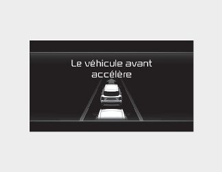 Lorsque le véhicule avant démarre suite à un arrêt, l'Alerte de départ du véhicule de tête informe le conducteur au moyen du message « Leading vehicle is driving away » (Le véhicule de tête s'éloigne) sur le tableau de bord et un avertissement sonore retentira.