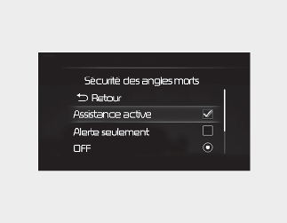 Le commutateur ENGINE START/STOP (démarrage/arrêt du moteur) à la position ON, sélectionnez l’option « Driver Assistance → Blind Spot Safety → Blind Spot View » (Assistance au conducteur - Sécurité angle mort - Vue angle mort) à partir du menu « Settings » (Réglages) pour activer l’écran de vision de l'angle mort et désélectionnez ladite option pour désactiver le système.
