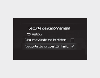 Avec le bouton ENGINE START/STOP en position ON, sélectionnez « Driver Assistance → Parking Safety → Rear Cross-Traffic Safety » (assistance au conducteur - sécurité stationnement - sécurité circulation transversale arrière) à partir du menu des réglages pour activer l'assistance à l'évitement des collision de circulation transversale arrière, puis désélectionnez la fonction pour désactiver le système.