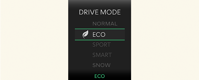 Lorsque le mode de conduite est réglé sur le mode ECO, la logique de commande du moteur et de la boîte de vitesses est modifiée pour optimiser la consommation de carburant.