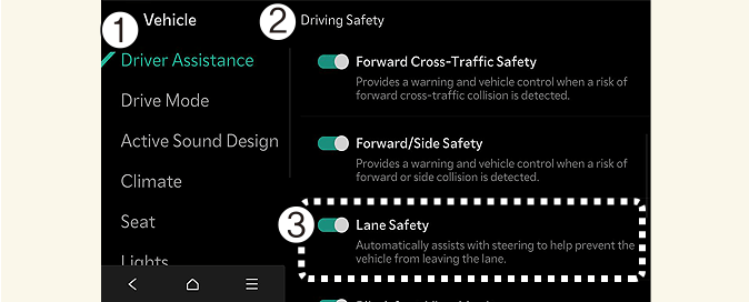 L'avertissement sonore de sécurité de voie désactivé peut être réglé lorsque les deux volume d'avertissement et le système d'avertissement haptique sont activés