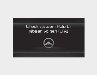 Als Lane Following Assist niet goed werkt, verschijnt de waarschuwing ‘Check Lane Following Assist (LFA)-system’ (Check systeem Hulp bij rijbaan volgen (LFA)) en gaat het waarschuwingslampje branden op het instrumentenpaneel (dooft uit na een bepaalde tijd).