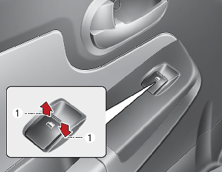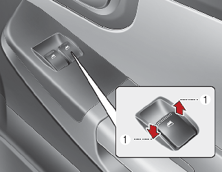 The driver’s door has a master power window switch that controls the front windows in the vehicle. To open or close a window, press down (1) or pull up (1) the front portion of the corresponding switch.