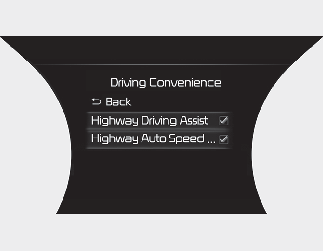 With the ENGINE START/STOP button in the ON position, select 'Driver Assistance → Driving Convenience' from the setting menu to set whether or not to use each function.