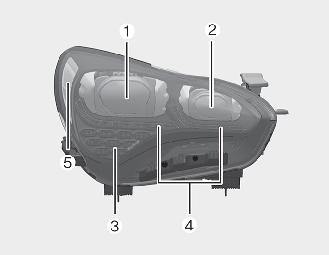 If the Low/High beam lamp(1), Low/High beam assist lamp (2), Front turn signal lamp (3), Day time running lamp/Position lamp (4) or Side marker (5) does not operate, have the vehicle checked by an authorized Kia dealer.