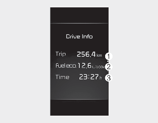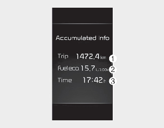 This display shows the trip distance (1), the average fuel efficiency (2), and the total driving time (3) information once per one ignition cycle.