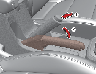 To release the parking brake, first apply the foot brake and pull up the parking brake lever slightly. Secondly depress the release button (1) and lower the parking brake lever (2) whilst holding the button.