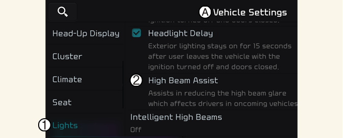 Sæt køretøjet i ON-position, vælg Indstillinger → Køretøj → Lys og lamper → HBA (Fjernlysassistance) i menuen Indstillinger for at tænde for funktionen Fjernlysassistance.