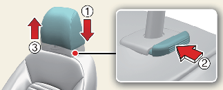 To lower the headrest, push and hold the release button (2) on the headrest support.