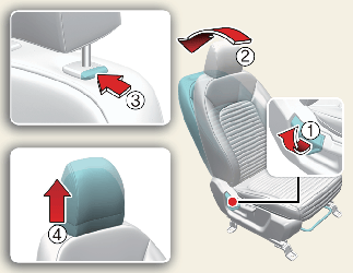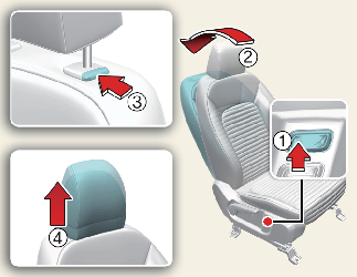 Press the headrest release button (3) whilst pulling the headrest up (4).