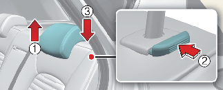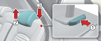 To lower the headrest, push and hold the release button (2) on the headrest support and lower the headrest to the desired position (3).
