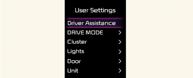 In this mode, you can change the settings of the instrument cluster, doors, lamps, etc.