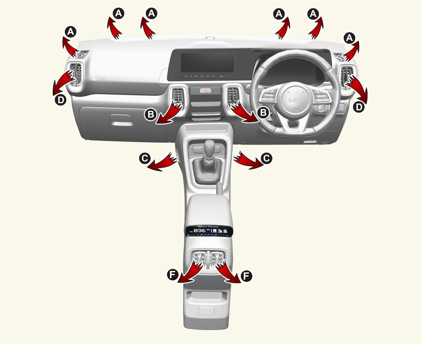Most of the air flow is directed to the floor, with a small amount of the air being directed to the windscreen, side window defrosters and side air vents.
