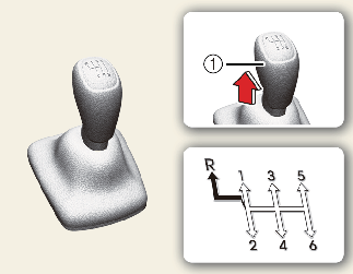 Push the button located immediately below the shift knob and pull the gearshift lever to the left sufficiently, and then shift into reverse (R) gear position.