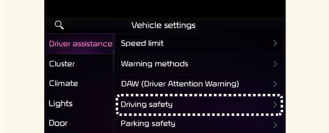 With the vehicle on, touch User settings → Driver assistance → Driving safety → Driving safety on the instrument cluster or Settings → Vehicle → Driver assistance → Driving safety on the infotainment system. You can select or deselect each function in this menu.