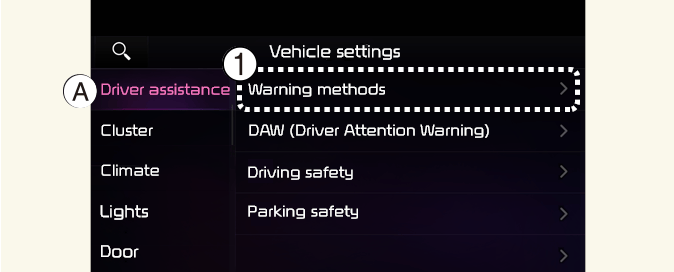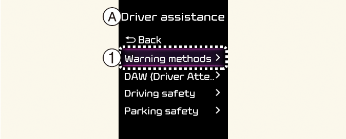 If you change the Warning Methods, it can be applied to each function of the driver assistance system. Please check and change it in each function.