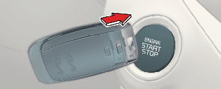 If the battery is weak or the smart key does not work correctly, you can start the engine by pressing the ENGINE START/STOP button with the smart key. When you press the ENGINE START/STOP button directly with the smart key, the smart key should contact the button at a right angle.