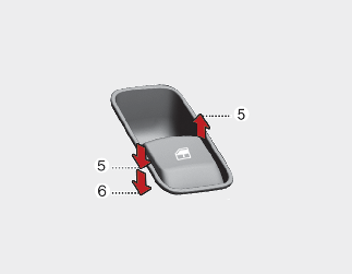 Pressing or pulling up the power window switch momentarily to the second detent position (6) completely lowers or raises the window even when the switch is released. To stop the window at the desired position whilst the window is in operation, pull up or press down and release the switch.
