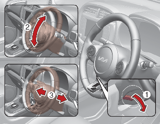 To change the steering wheel angle, pull down the lock release lever (1), adjust the steering wheel to the desired angle (2) and height (3), then pull up the lock-release lever (4) to lock the steering wheel in place. Be sure to adjust the steering wheel to the desired position before driving.
