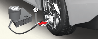 With the ENGINE START/STOP button position on or ignition switch position on, switch on the compressor and let it run for approximately 5~7 minutes to fill the sealant up to proper pressure. (refer to More Details). The inflation pressure of the tire after filling is unimportant and will be checked/corrected later. Be careful not to overinflate the tire and stay away from the tire when filling it.