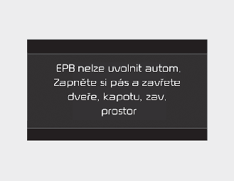 • Pokud nastala porucha vozidla, zazní varovný zvuk a zobrazí se hlášení. Pokud taková situace nastane, sešlápněte brzdový pedál a elektronickou parkovací brzdu uvolněte spínačem EPB.