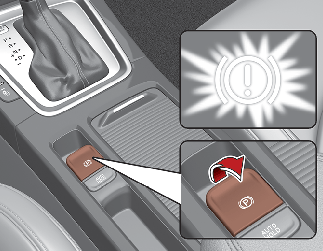 • Pokud během řízení dojde k problému s brzdovým pedálem, je možné využít nouzového brzdění pomocí stisknutím a podržením spínače elektronické parkovací brzdy EPB. Brzdění je možné pouze tehdy, když je stisknut spínač EPB. Pokud pustíte spínač EPB, brzdný účinek pomine. Pokud spínač EPB držíte a vozidlo zastaví, EPB se zatáhne.