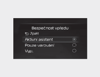 Když bude v nabídce nastavení zvolena možnost ‚Off‘ (Vypnuto), asistenční systém pro předcházení čelnímu nárazu nebude fungovat, a proto musí být řidič stále věnovat pozornost okolí a jet bezpečně.