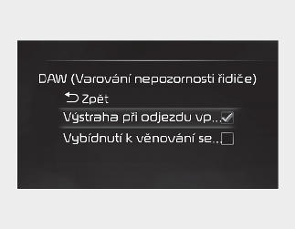 Se spínačem zapalování nebo tlačítkem ENGINE START/STOP (Nastartování/vypnutí motoru) v poloze ON (Zapnuto) můžete výběrem položky „User Settings → Driver Assistance → Driver Attention Warning" (Uživatelské nastavení → Jízdní asistenti → Systém sledování bdělosti řidiče) na displeji LCD nebo v informačním systému nastavit, zda se příslušná funkce má či nemá používat.