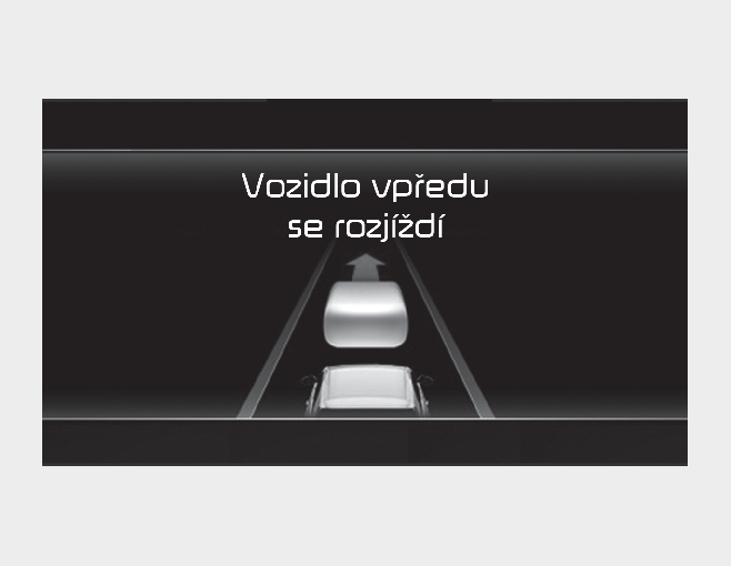 Když se detekované vozidlo vpředu začne rozjíždět, funkce upozornění na rozjetí vozidla vpředu řidiče upozorní zobrazením zprávy „Leading vehicle is driving away“ (Vozidlo vpředu odjíždí) na přístrojovém panelu a zazní zvuková výstraha.