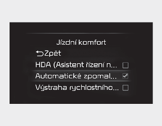 Se spínačem zapalování nebo tlačítkem ENGINE START/STOP (Nastartování/vypnutí motoru) v poloze ON (Zapnuto) můžete výběrem položky „User Settings → Driver Assistance → Driving Convenience" (Uživatelské nastavení → Jízdní asistenti → Usnadnění řízení) na displeji LCD nebo v informačním systému nastavit, zda se příslušná funkce má či nemá používat.