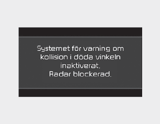 Om detta inträffar kommer varningsmeddelandet “Blind-Spot Safety system disabled. Radar blocked” (Säkerhetssystem för döda vinkeln avaktiverat. Radar blockerad) visas i klustret.