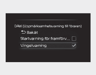 Om varningen Framförvarande fordon startar väljs informeras föraren när ett upptäckt fordon framför börjar köra efter att ha stått stilla.