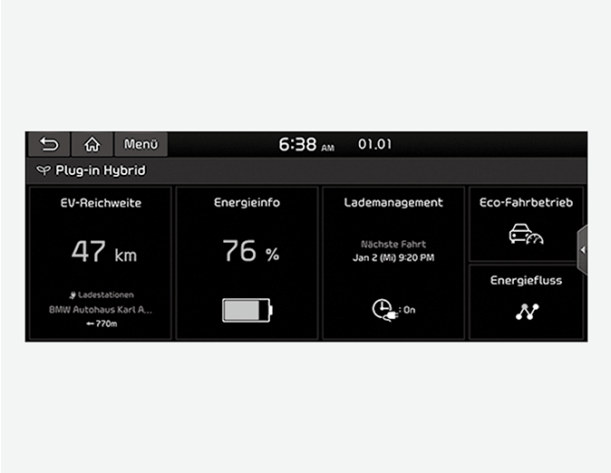 Das Menü des Plug-in-Hybrid besteht aus fünf Abschnitten: [EV-Reichweite], [Energieinformationen], [Lademanagement], [Wirtschaftliche Fahrweise], [Energiefluss].
