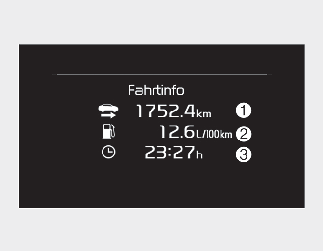 Dieser Bildschirm zeigt die Gesamtfahrstrecke (1), den Durchschnittsverbrauch (2) und die Gesamtfahrzeit (3) nach dem Auftanken.