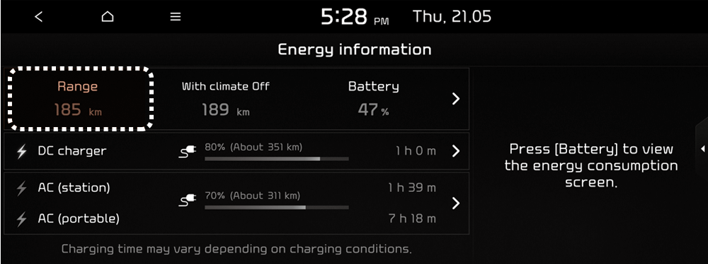 You can check the reachable range, battery power remaining, and expected charging time for each charger type.
