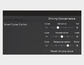 With the vehicle on, select Settings → Driver Assistance → Driving Convenience → Smart Cruise Control on the instrument cluster or Settings → Vehicle → Driver Assistance → Driving Convenience → Smart Cruise Control on the infotainment system to set the distance, acceleration and the reaction speed.