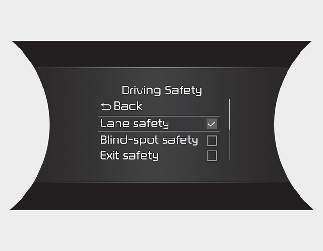 Lane Safety: If Lane safety is selected, Lane Keeping Assist will automatically assist the driver's steering when lane departure is detected to help prevent the vehicle from moving out of its lane. If Lane safety is off, the yellow indicator light (