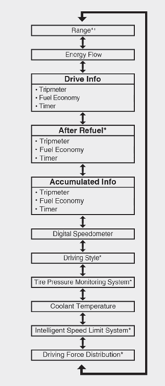 This display shows the trip distance, the average fuel efficiency, and the total driving time information once per one ignition cycle.