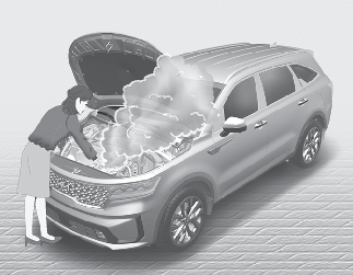 냉각수나 뜨거운 증기가 냉각수 탱크에서 흘러 나오면 엔진을 멈추고 자사 직영 서비스센터 또는 서비스협력사에 연락하십시오. 냉각수가 흘러나오지 않으면 엔진을 계속 돌게 한 상태에서 후드를 열어 엔진 실내에 통풍이 잘 되도록 하여 엔진을 식히십시오. 엔진이 회전되면서 수온계가 떨어지지 않으면 엔진을 멈추고 냉각되도록 충분한 시간을 기다리십시오.