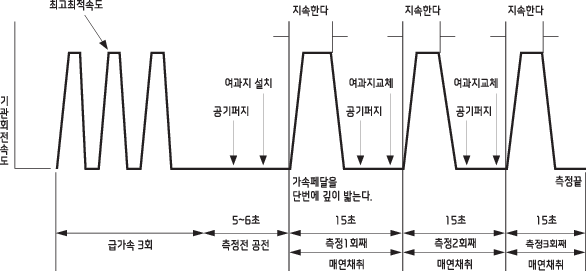 매연 측정 전 배기계에 쌓인 매연을 제거 하기 위해 불어 내기를 3회 실시합니다. (불어 내기 방법은 공회전 상태에서 최고 회전 속도까지 2초 내 도달한 후 2초간 유지합니다. 다시 공회전 상태로 5~6초간 유지한 후 동일한 방법으로 불어내기를 총3회 실시하십시오.)