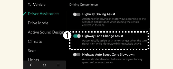 Якщо вибрано систему допомоги під час зміни смуги на автомагістралі, вона допомагає водієві безпечно змінювати смугу.