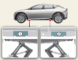 Установіть домкрат попереду (1) або позаду (2) визначених положень підйому на домкрат.