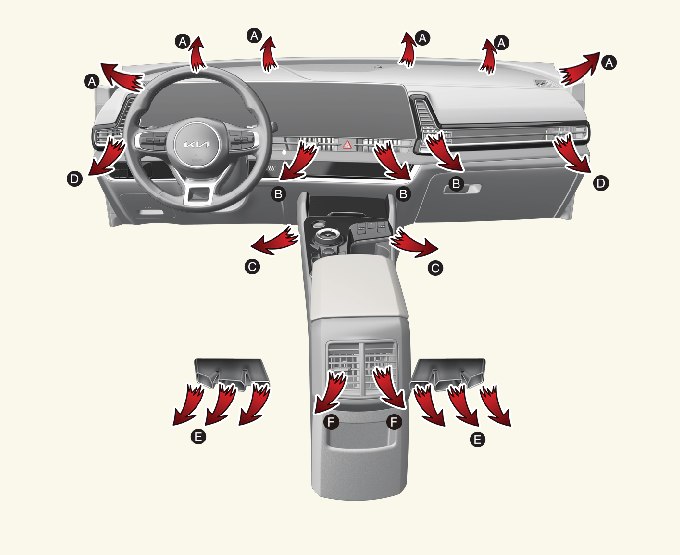 Поток воздуха направляется в лицо человека и в нижнюю часть салона. |