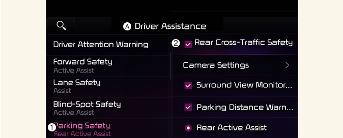 При повторном запуске двигателя функция предотвращения столкновения с объектами, движущимися в поперечном направлении позади автомобиля, включается автоматически. Однако в случае выбора «Off» (Выкл.) после перезапуска двигателя водитель должен внимательно следить за ситуацией на дороге и соблюдать правила безопасности.