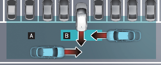 [B]: рабочий диапазон системы предотвращения столкновений с объектами, движущимися в поперечном направлении позади автомобиля