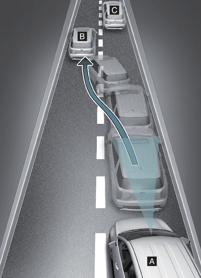 Если впереди идущий автомобиль (B) перестраивается, система помощи по предотвращению лобового столкновения может не сразу определить автомобиль (C). В этом случае необходимо поддерживать безопасную дистанцию торможения и при необходимости управлять автомобилем и нажимать на педаль тормоза для снижения скорости движения с целью поддержания безопасной дистанции.