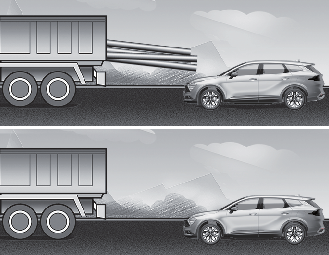 Если впереди идущий автомобиль имеет груз, выступающий сзади за пределы автомобиля, или если автомобиль имеет высокий дорожный просвет, соблюдайте особую осторожность. Система предотвращения лобового столкновения может не обнаружить груз, выходящий за габариты транспортного средства. В этих случаях необходимо поддерживать безопасную дистанцию торможения от крайнего объекта и при необходимости управлять автомобилем и нажимать на педаль тормоза для снижения скорости движения с целью поддержания требуемой дистанции.