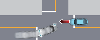 Функция поворота на перекрестке применяет экстренное торможение, чтобы избежать столкновения со встречным транспортным средством на соседней полосе при повороте на перекрестке налево (левый руль) или направо (правый руль) с включенным сигналом поворота.